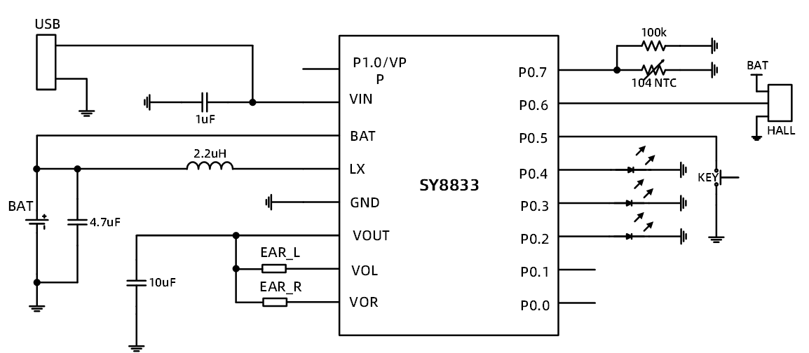 SY8833是專門為TWS耳機(jī)充電倉設(shè)計的全集成SoC芯片。SY8833內(nèi)部集成了兼容8051指令集的CPU,256字節(jié)RAM, 4k字節(jié)OTP程序存儲區(qū),多通道10位ADC,9個GPIO,一個線性充電模塊,一個Boost升壓模塊和兩個獨立放電控制MOS管。
