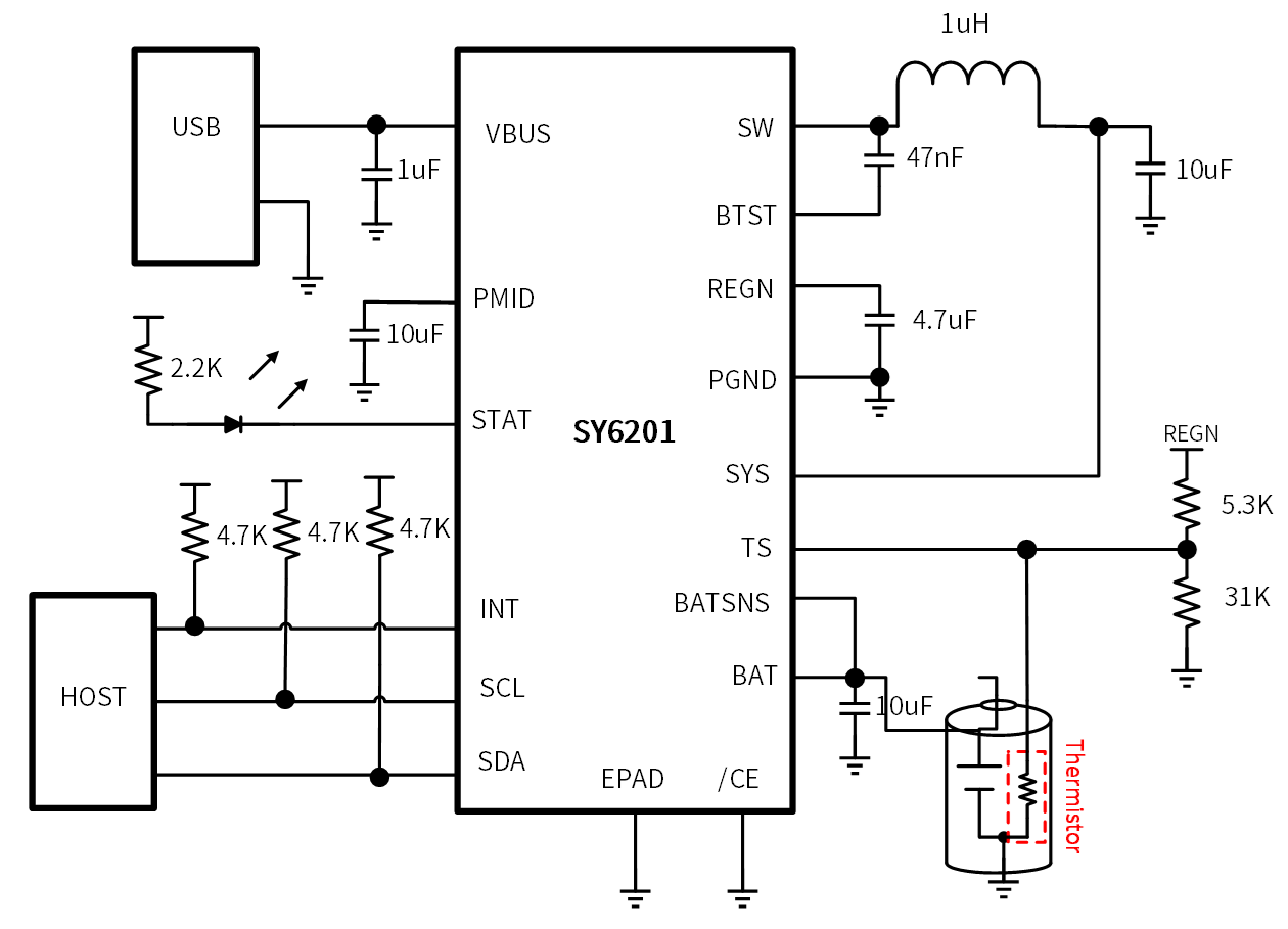SY6201 is a low-power and high-precision switch charger of NVDC architecture. It integrates charge, boost converter and protections, optimized for fast charging applications of small capacity lithium-ion batteries, charging current up to 2A and termination current down to 10mA. The standby current is less than 13uA and ship mode current is less than 3uA.