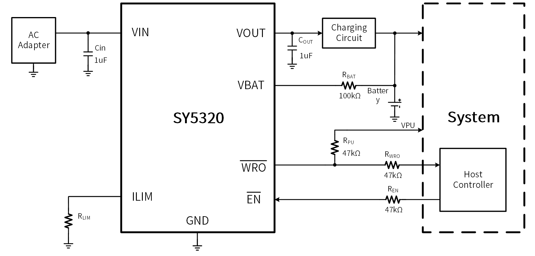 The SY5320 is a highly integrated circuits with input under-voltage and over-voltage protection, battery over-voltage protection, abnormal load current protection, over temperature protection. SY5320 is used at the front end of charging circuits or low-voltage systems, it can withstand high input voltages up to 28V. When the input voltage exceeds the overvoltage protection threshold, the internal MOSFET will be turned off within 1μs to protect the back-end low-voltage system. When the battery voltage exceeds 4.45V, the IC will turn off the MOSFET to protect the lithium battery. The IC will limit the input current to a safe value by using the external resistance between ILIM and GND.