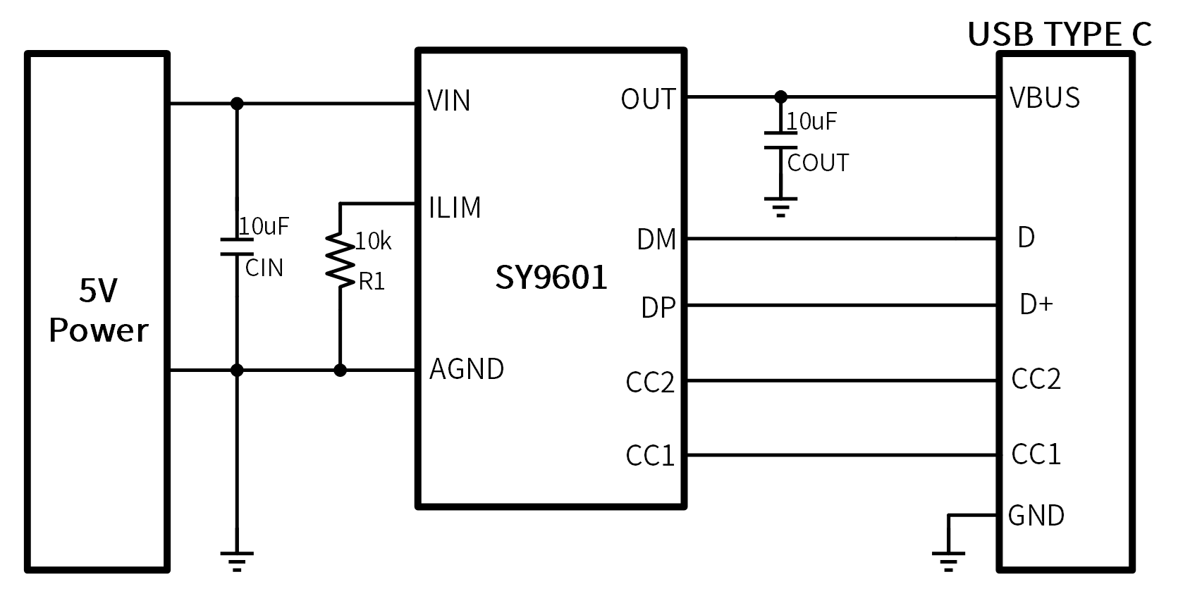 SY9601 is a current-limiting IC integrating Type-C and BC1.2 protocols, with adjustable output limited current, PMOS switch with maximum limited current of 3A, D+/D supporting BC1.2 protocol, which provides automatic identification of mobile phones such as iPhone and Samsung, and ensures maximum charging power. Type-C port output is provided for detecting CC connection before turning on the current limit switch and indicating the maximum output current capability. SY9601 is available in a ESOP8 or DFN10 package.