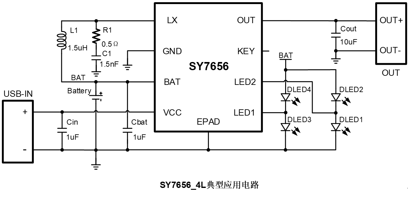 KEY鍵及LED指示,可訂制版本及功能——SY7656_2L:無需接KEY鍵,升壓常輸出,輕載自動(dòng)關(guān)閉LED顯示;2顆LED充/放電狀態(tài)指示; SY7656_KEY2L:單擊KEY鍵顯示電量并啟動(dòng)/關(guān)閉升壓,自動(dòng)關(guān)機(jī)功能(VOUT掉到0V);2顆LED充/放電狀態(tài)指示; SY7656_4L: 無需接KEY鍵,升壓常輸出,輕載自動(dòng)關(guān)閉LED顯示;4顆LED充/放電狀態(tài)指示; SY7656_KEY4L:單擊KEY鍵顯示電量并啟動(dòng)/關(guān)閉升壓,自動(dòng)關(guān)機(jī)功能(VOUT掉到0V);4顆LED充/放電狀態(tài)指示。