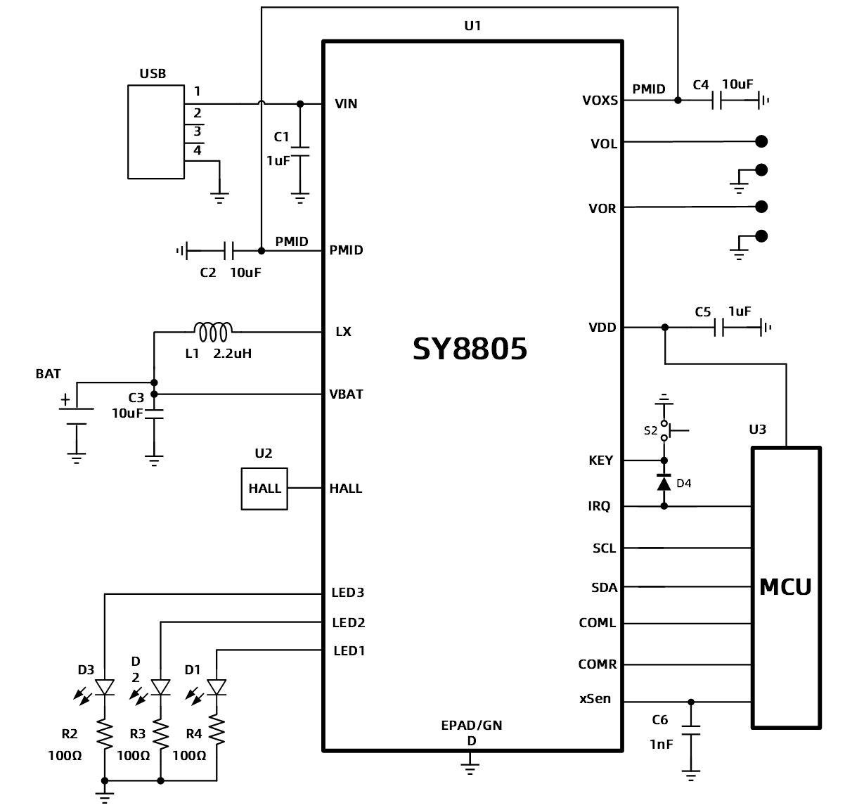 SY8805集成了標(biāo)準(zhǔn)的I2C接口,方便實(shí)現(xiàn)芯片和MCU之間的通信,控制充電、放電功能。